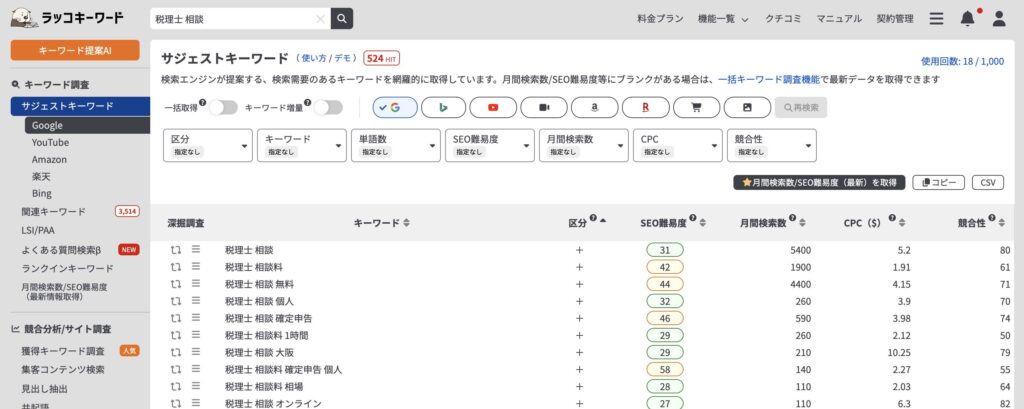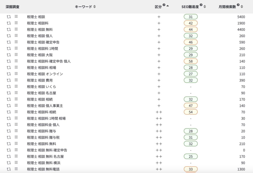 月間検索数が低めのスモールキーワードでも競合が強いキーワードがあります。税理士、会計士のキーワードはスモールキーワードでも競合が強い場合が多いため、競合が強くないキーワードを選ぶことが大事です。