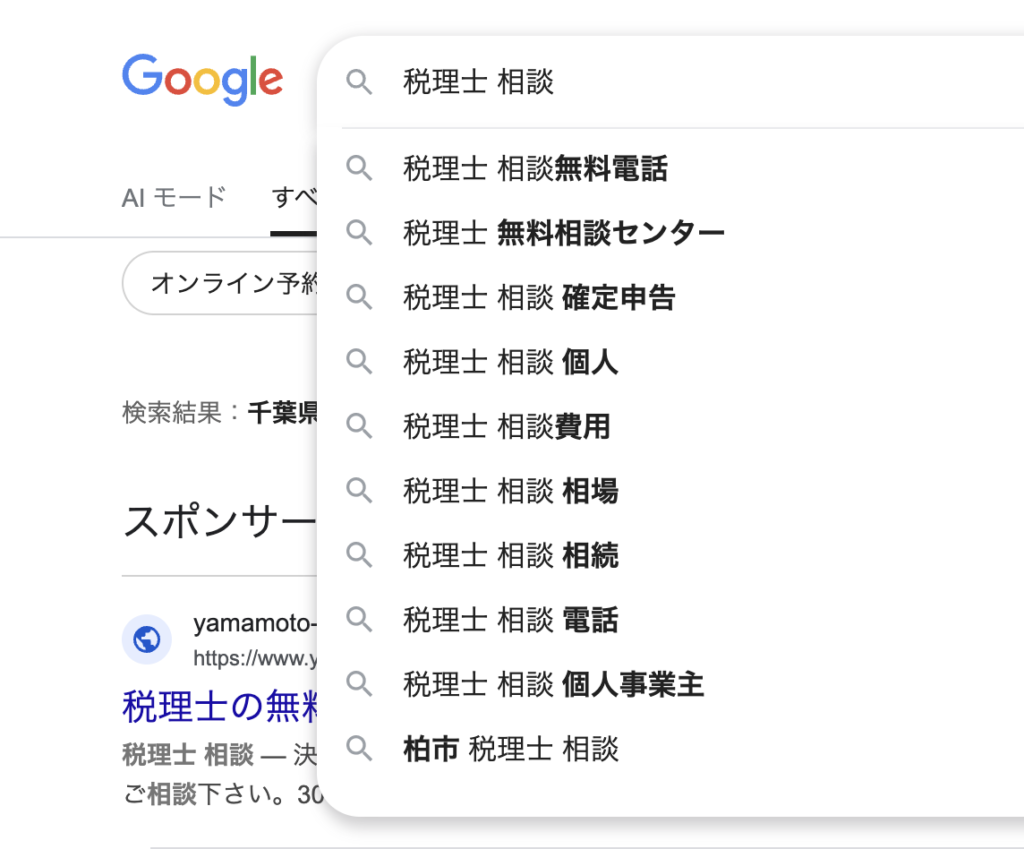 このように表示されます。検索窓に「税理士 相談」と入力すると、他にも候補のキーワードをGoogleが提示してくれます。