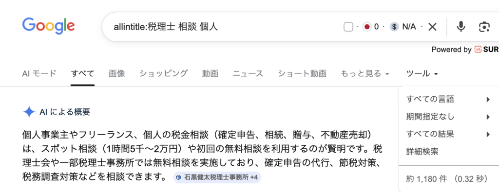 このように入力し、エンターをします。その後、検索窓の右下のツールをクリックし一番下に出てくる数値(以下の場合は1,180件)をチェックします。
